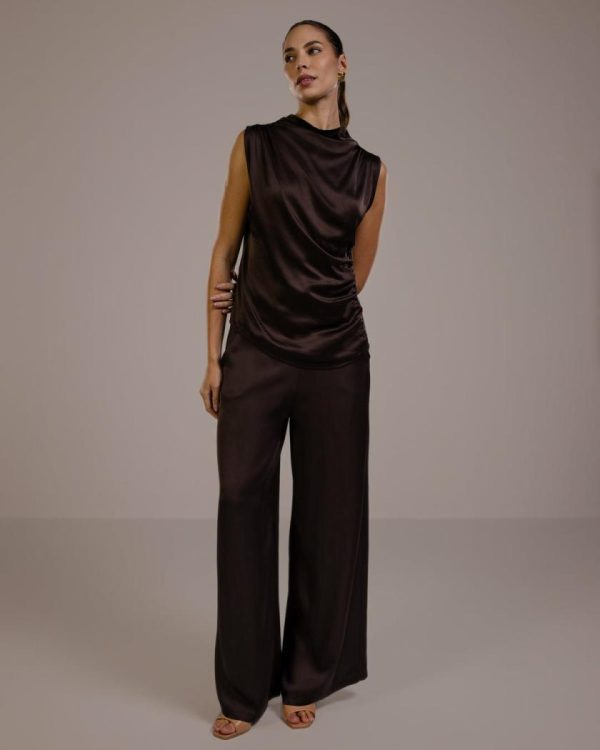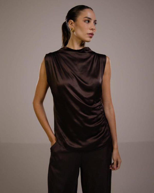 Crafted in Italy from luxurious mid-weight satin. Featuring pin-tucked detailing on one shoulder and side, creating a beautifully gathered effect that enhances the fabric’s lustrous sheen. Sleeveless, with a slim-stretch fit and a high neckline, it exudes modern sophistication. Made to be worn with our luxe-satin skirts or trousers for a polished look.