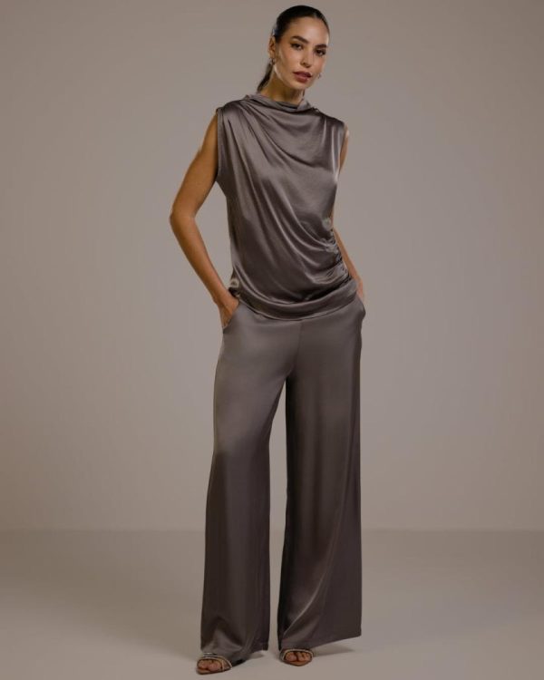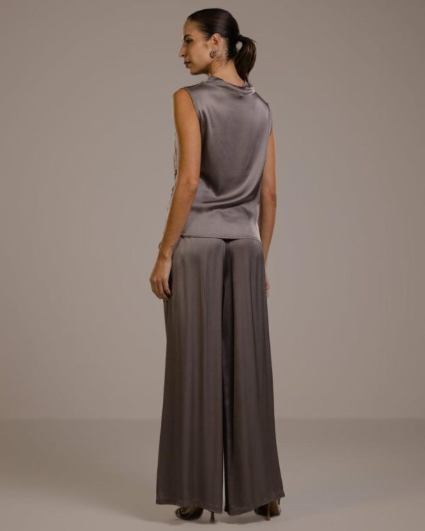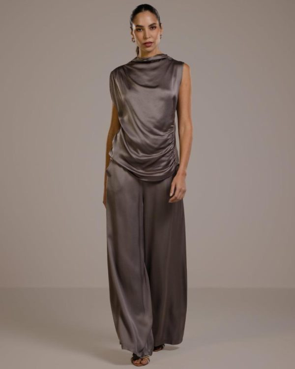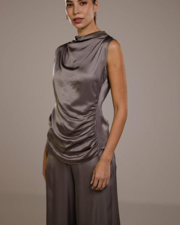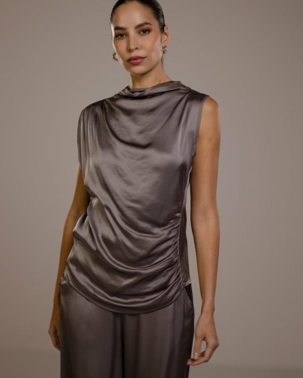 Crafted in Italy from luxurious mid-weight satin. Featuring pin-tucked detailing on one shoulder and side, creating a beautifully gathered effect that enhances the fabric’s lustrous sheen. Sleeveless, with a slim-stretch fit and a high neckline, it exudes modern sophistication. Made to be worn with our luxe-satin skirts or trousers for a polished look.