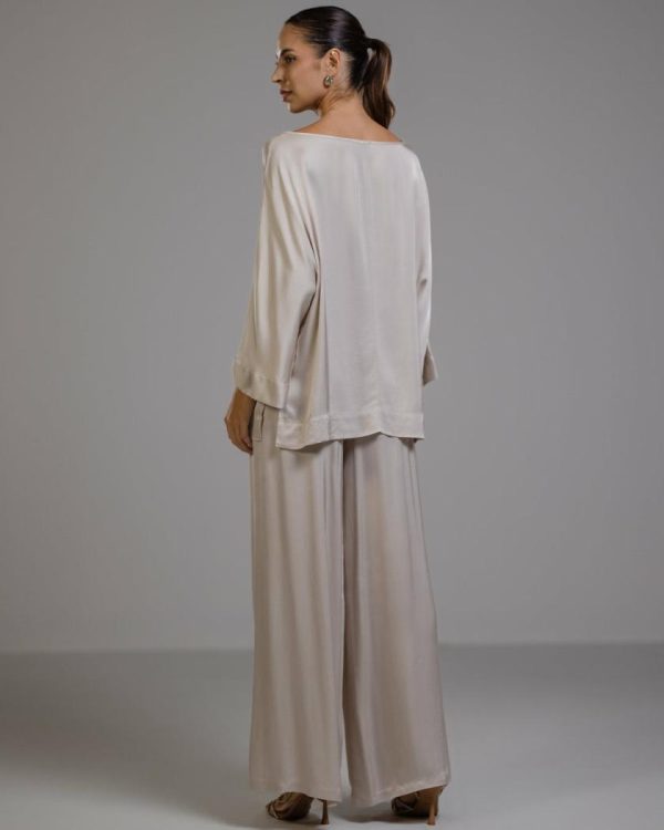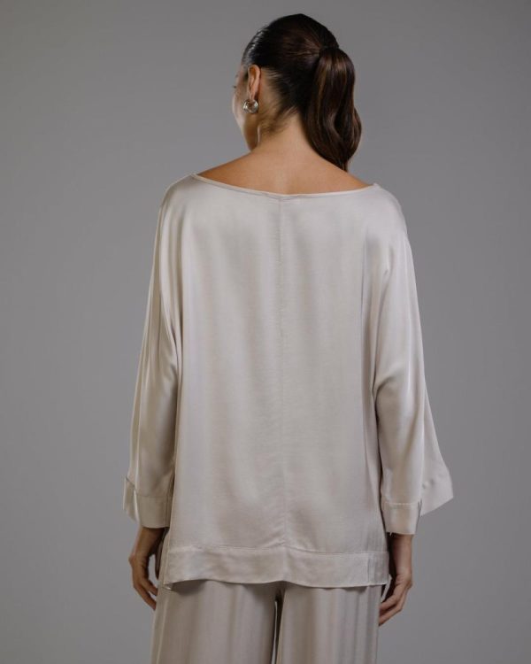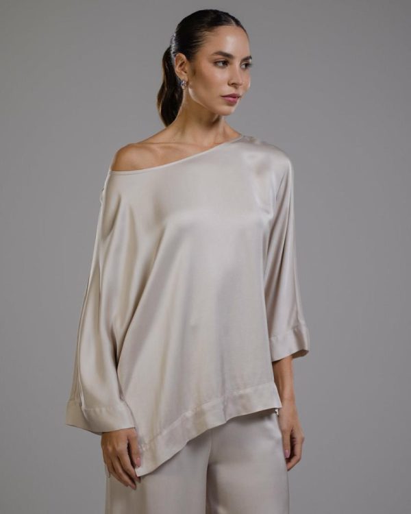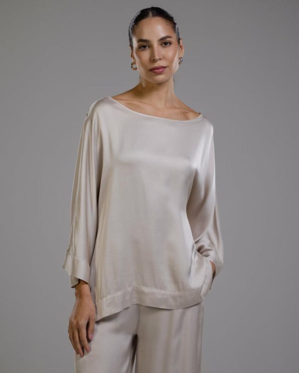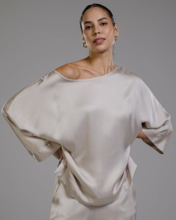 Wrap yourself in relaxed luxury with our Satin Top. Its soft, shimmering satin glides over the skin, while the loose structure brings an effortless elegance. A wide, open neckline lets you play with styling – why not wear it off-shoulder for a carefree twist? Deep, statement hems at the waist and cuffs add a bold, tailored touch. Tuck in for a fitted silhouette or leave out for a fresh take on easy glamour. Your style, your rules.
